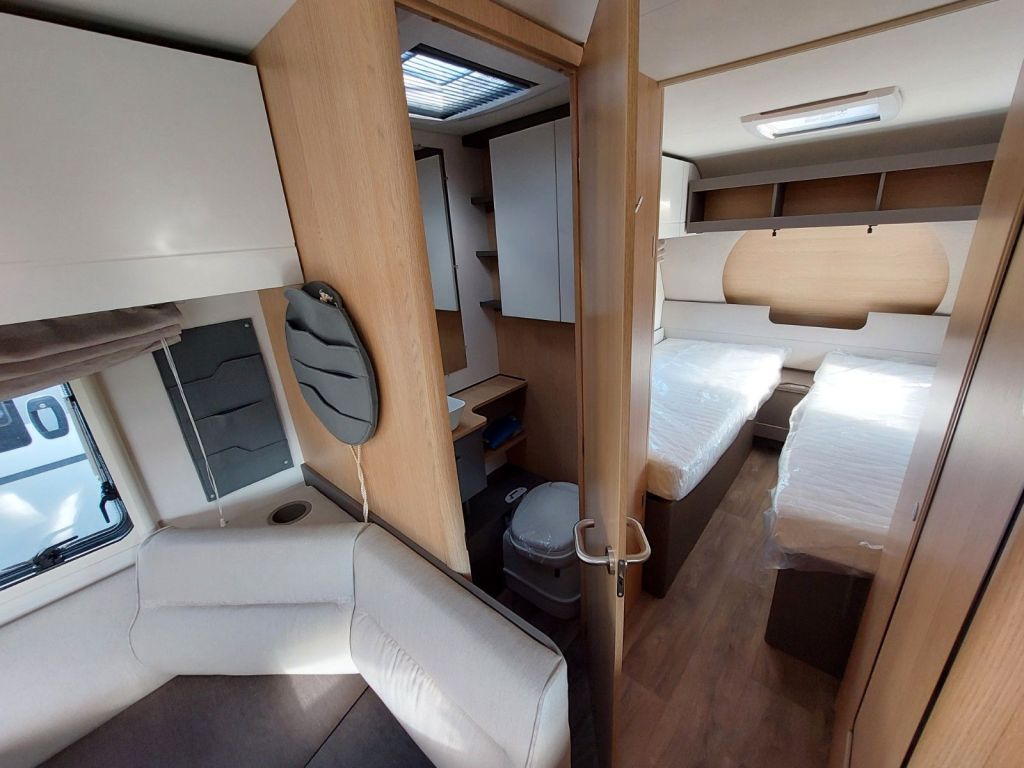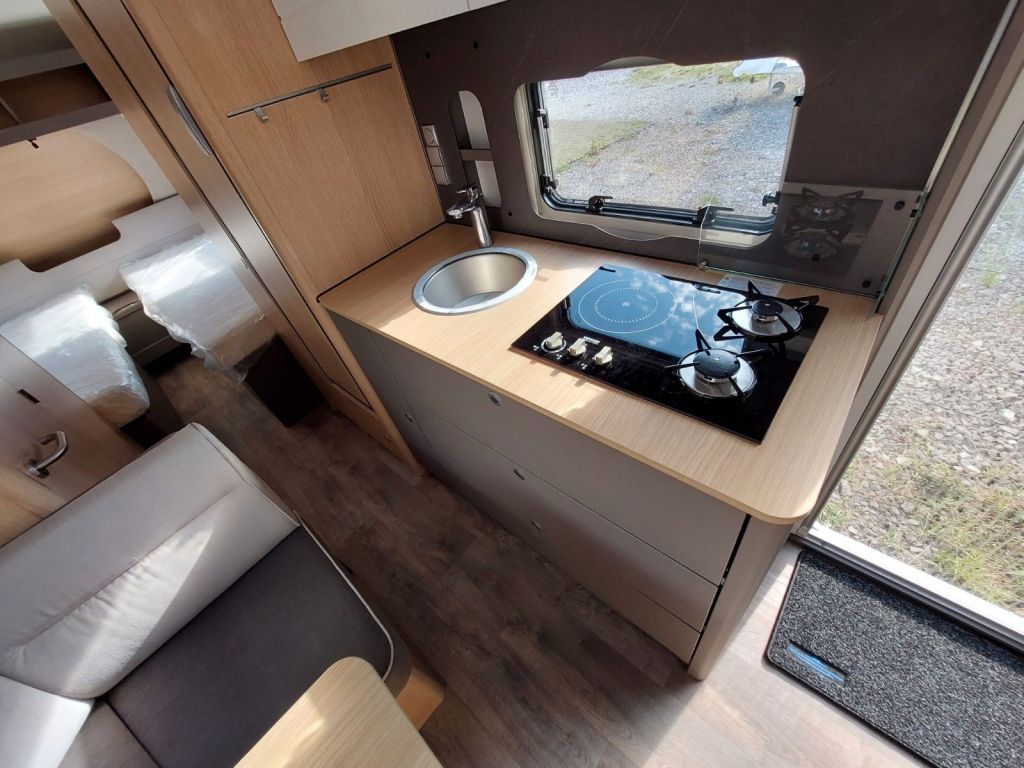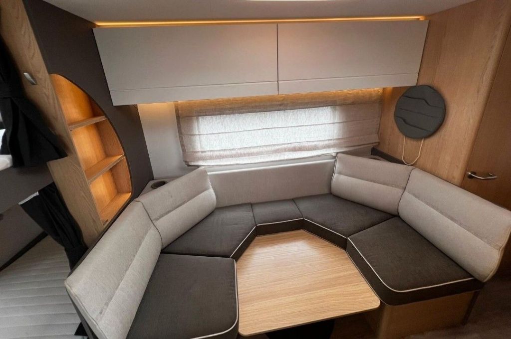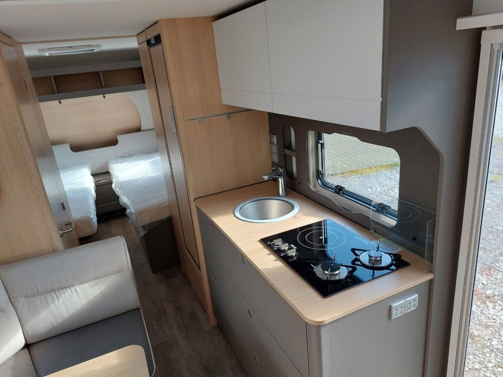 70 cm mit Fenster einteilig inkl. Abfalleimer, Rahmenfenster mit Combirollos, Rollbett, Dachverstärkung inkl. Vorbereitung Klimaanlage, Fliegenschutztür, Fliegenschutztür, Winterrückenbelüftung, Kombi-Kochfeld mit Induktion und Gas, Kühlschrank mit Frostfach, Heizung Umluft Combi 6 mit Bedienteil CP classic, Abwassertank 25 l rollbar, Frischwassertank 44 l mit Außeneinfüllstützen, Kassetten-Toilette, Vorbereitung TV-Platz uvm.
